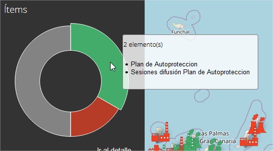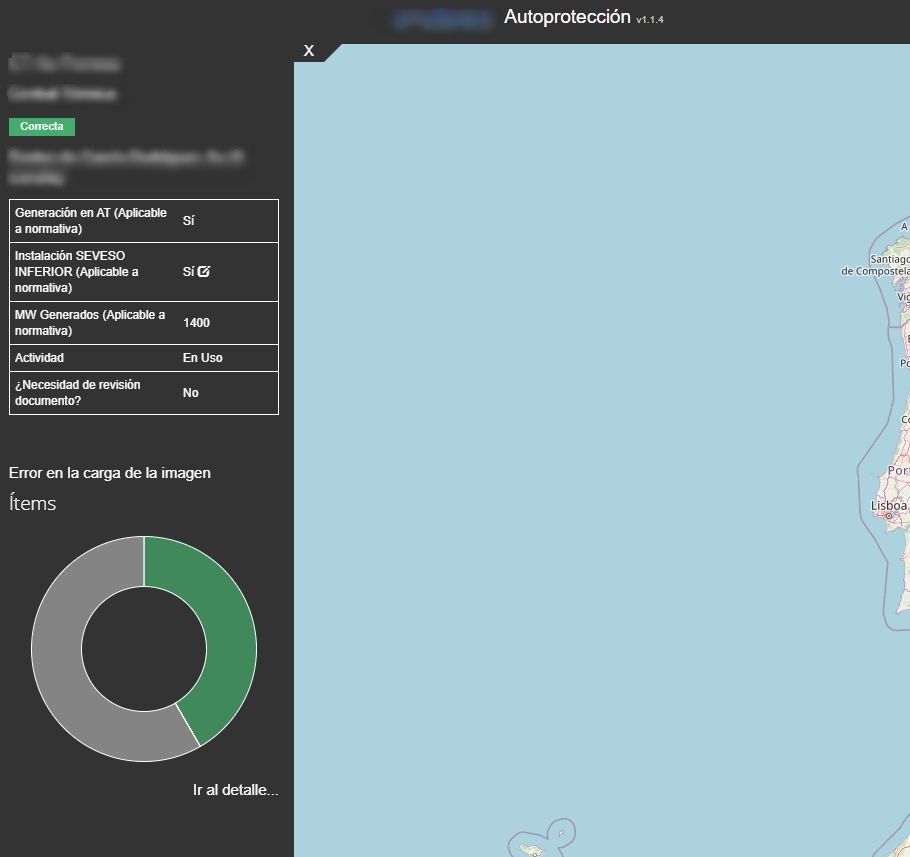 Cuando se selecciona una instalación que no tiene toda la documentación correcta se muestra también la información relativa al centro y un gráfico de anillos en el cual aparecerán todos los ítems tanto los que no son requeridos, como los ítems de obligado cumplimiento.