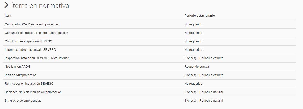 En los ‘Ítems en normativa’ aparecen los ítems asociados a la normativa, es decir, los requisitos documentales que se mencionan en la normativa (para más información sobre ítems consultar el apartado 2.3 del manual). Al lado aparecerá su periodo estacionario: